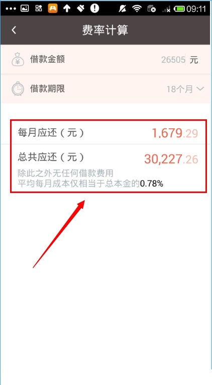 五、选择好借款期限后即可马上算出每月应还和总共应还金额。