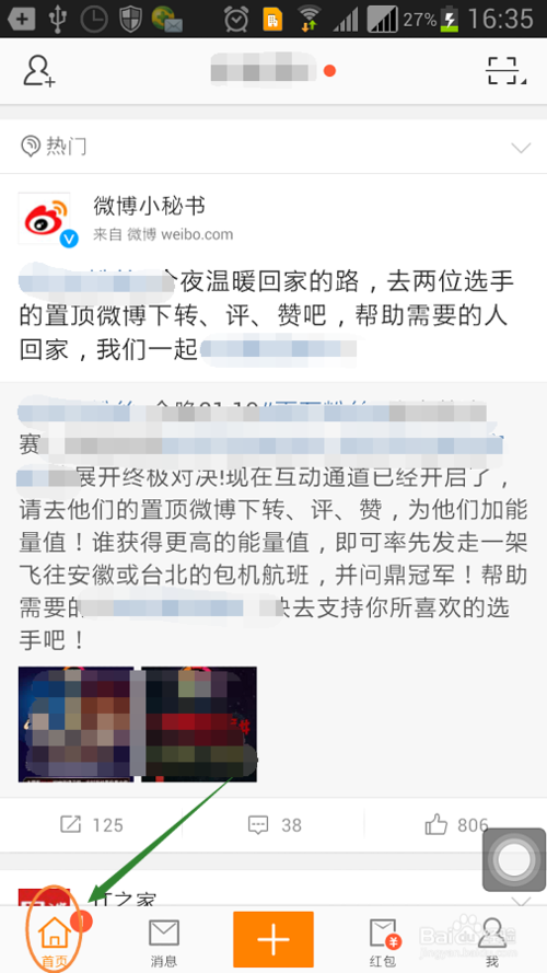 2、第一次打开的页面是位于微博的“首页”页面,我们将其切换至“我”