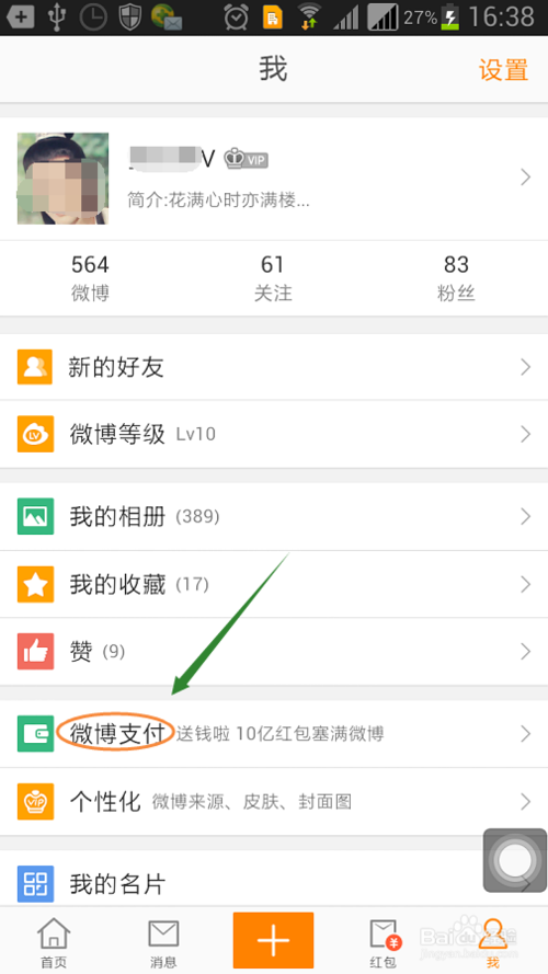 3、在“我”页面里,我们可以看到“微博支付”选项,点击会跳转到支付页面