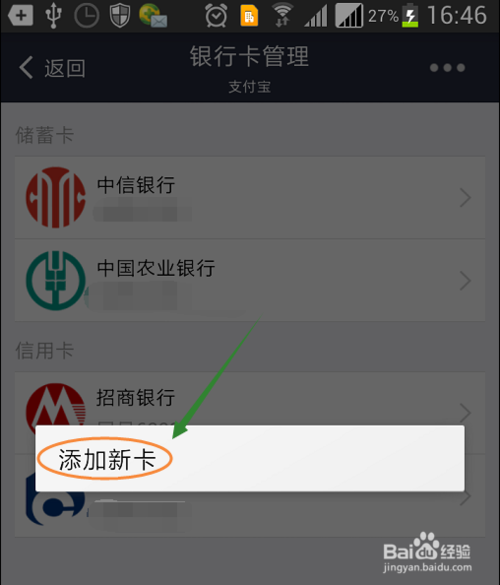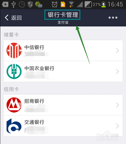 5、以上其实都是支付宝账户下的银行卡,我们在银行卡管理页面的右上角点击省略号图标,然后就可以添加新卡了,这个银行卡才是与新浪微博绑定的