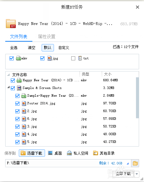 一般BT种子,集合的文件比较多,在如图的对话框上有可以自由的选你想要的文件的格式(也可手动选择,有对勾代表选中,这样可以避免下载一些垃圾文件)。