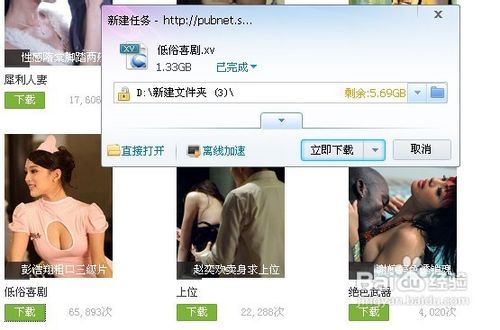 打开迅雷大全,选择想要看的电影,比如“低级喜剧”,找到下载这个小图标。点击一下。找到下载专区。弹出如图对话框,点击“立即下载”.现在可以在迅雷下载列表里,看到自己下载的电影了。注意:下载电视剧会弹出如下对话框,如下载电影不同(需要自选择集数)。