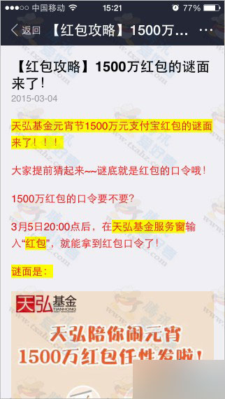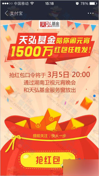 支付宝携手天弘基金元宵节发1500万红包 今晚八点开始