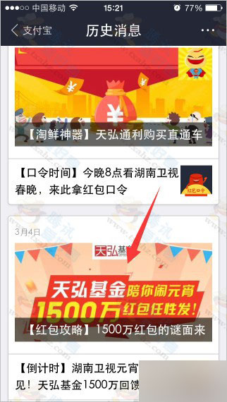 1、打开支付宝(8.5版以上)点击“天弘基金壕放千万红包”活动入口,猛戳“抢红包”提前关注服务窗。