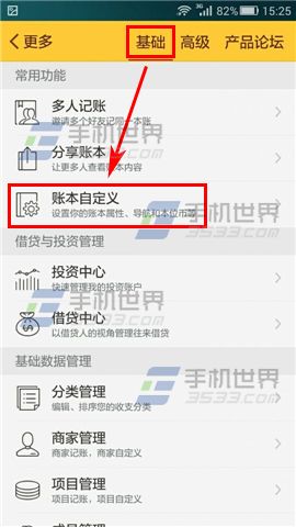 1)打开随手记,点击右下角的【更多】,选择【基础】栏的【账本自定义】;(如下图)