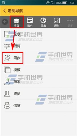 2)选择【首页导航】,点击需要替换的栏,然后点击要替换的功能,比如将第一栏的【项目】替换成【同步】;(如下图)