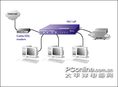 推荐理由:这款美国网件的防火墙FR114P集网络地址转换(NAT)、路由器、交换机、防病毒、打印服务器功能为一体,性价比相当高,是小型网吧网络的最佳选择。该防火墙具有1个WAN端口,4个LAN端口,1个打印服务器端口;FR114P的10/100M WAN接口能支持各种宽带方式的接入,如xDSL、CableModem、以太网接入等;10/100M LAN接口用于内部网络的连接;打印服务器端口可支持大多数品牌的打印机的连接,方便提供网吧用户急需要打印的服务。