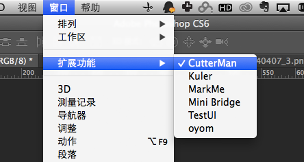 2. 安装完成之后,打开/重启photoshop,在菜单栏选择"窗口" -> "扩展功能" -> Cutterman就可以打开啦。