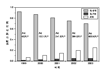 无线技术的媒介包括红外和射频等[3]。一般而言其实现成本要比有线网络技术稍高一些,这主要是用于通讯信号的转换处理方面的开支。但随着通讯技术和大规模集成电路技术的迅猛发展,其实现成本目前已逐渐具有与有线网络技术竞争的实力,而且应用的规模也在不断地扩大,图2为对美国目前家庭自动化网络系统中三种主要通讯媒介应用规模的统计和预测[2]。由图2可以十分明显地看出,无线网络技术的应用和需求比例正在不断地上升,而相应地有线网络技术总量所占比例在不断下降,这是一个总的技术发展趋势。