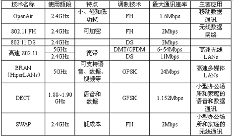 注:FH―Frequency hopping;DS―Direct sequence;DMT―Discrete multitone;OFDM―Orthogonal frequency division multiplexing;GPSK―Gaussian phase shift keying;GFSK―Gaussian frequency shift keying;SWAP―Shared wireless access protocol;