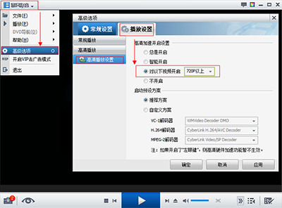 请您在高清加速设置中使用“对以下视频开启”,并根据您的需要选择720P或者1080P。