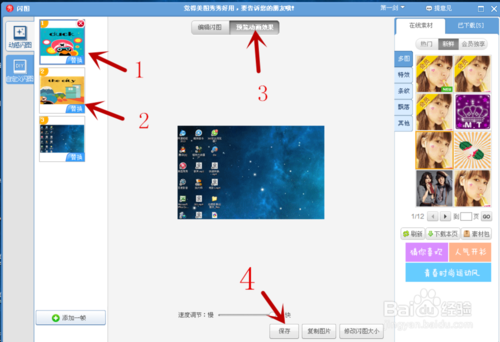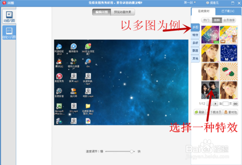 5、以多图为例。选择多图中一种特效,左上角,选择要用来制作的替换图片。事先,在桌面把要制作的图片保存好。点击预览效果,自己觉得满意了,就可以保存。