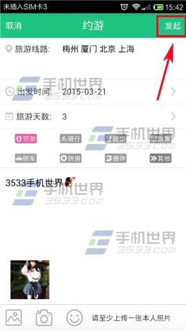 2)跳转至编辑页面,输入旅游地点,多个城市以空格隔开;接着选择好出发时间、旅游天数,并选择合适的标签,添加好描述后,还要上传一张自己的照片哦,最后点击【发起】就可以啦。(如下图)