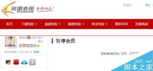 5、切换到迅雷会员页面,直接点击暂停按钮即可,本例有效期不足15天,不能暂停。一年可暂停6次,每月不超过3次,如需激活,同样进入此页面,一键激活。
