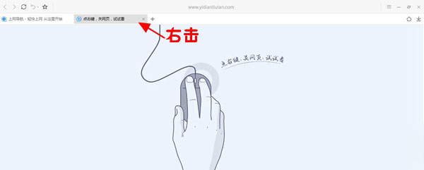 1,如果我们是第一次打开一点浏览器,那么页面就会有一个“点右击,关网页,试试看”的提示说明,如下图所示: