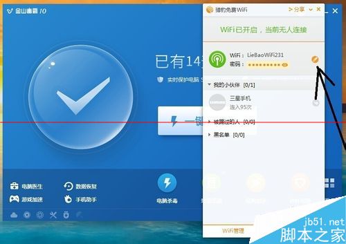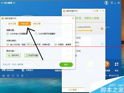 2、在功能界面,找到箭头所指的“免费WiFi”,鼠标点击,之后电脑就开始打开WiFi了。