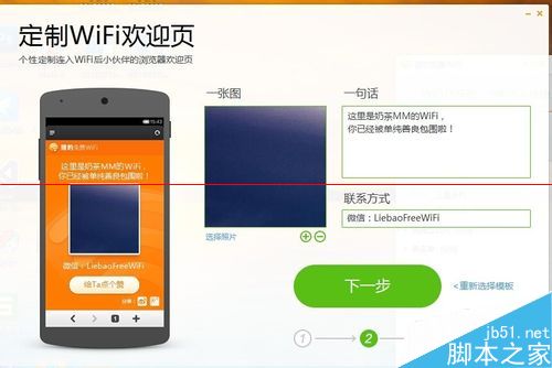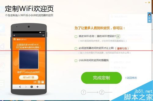 8、之后也可以添加一些趣味的文字,完成之后到第三步,选择“完成定制”,这样,当小伙伴接入我们的WiFi上网时,就会看到我们设置的欢迎界面了。