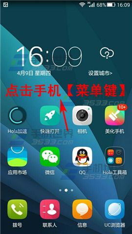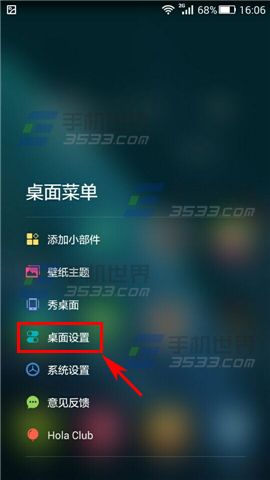 1)点击手机的【菜单键】,呼出Hola桌面菜单,选择【桌面设置】;(如下图)