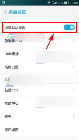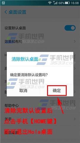 2)点击【设置默认桌面】,在提示框中点击【确定】,然后在点击手机的【HOME键】就可以退出Hola桌面了。(如下图)