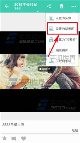 3)弹出选项,点击【设置为背景图】一项,进入到裁剪页面,裁剪好后【保存】即可设置成功。(如下图)