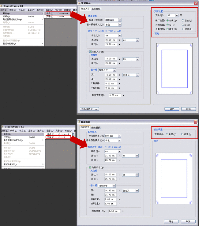 页面设定这部分关系到作品印刷,也可以说是关系到变成本本后的画质好坏。 我曾经遇到画好后要把尺寸由A4改成B5,这个过程不是直接等比缩放画面就可以的。漫画用到的网点纸、贴的位置、画面是否出血等,问题很多。 我无法容忍缩小印刷后网点变样(非屏幕上所见),于是用了最费力的方法:每页重排分镜,网点纸重贴。 最好能先考虑好尺寸,如果要出本子,会是多大的。要不然就选择比较流行的尺寸。或者试画一张,打印出来看网点效果。