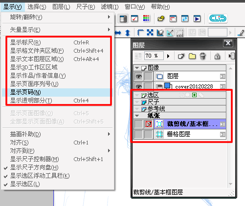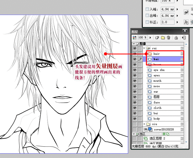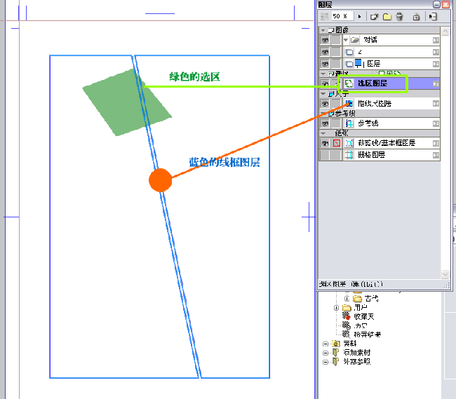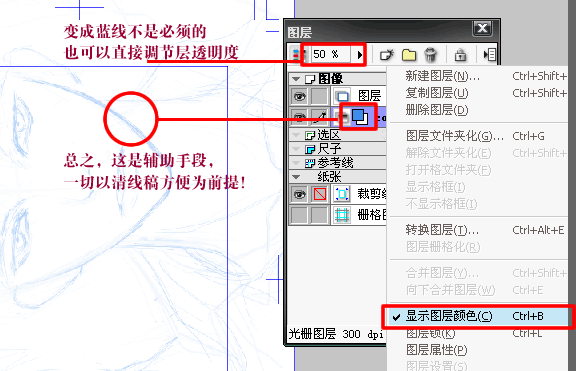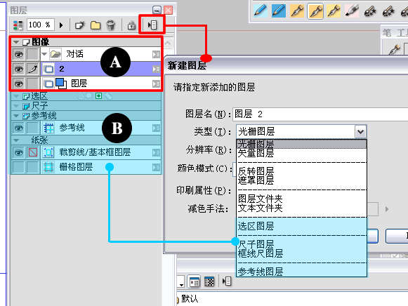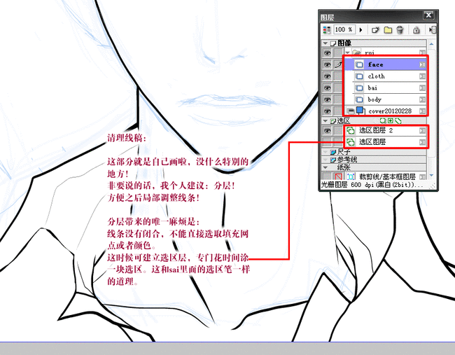 简单的说:红色的A部分是最终显示在导出后画稿上的;蓝色的B部分,侧不会出现在导出后的画稿上。 图中建立选区层、框线层,这些即使不删除,导出也不会留在画面中(基本上是这样。。。吧