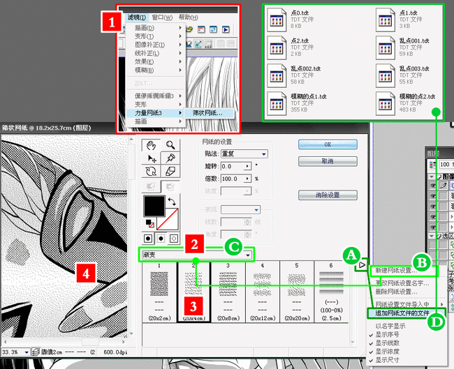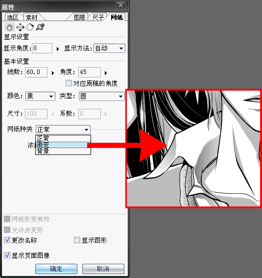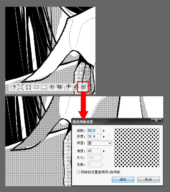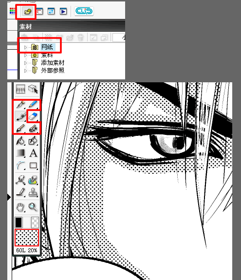 注: 通过【素材】贴的网点纸会自动建立一层,如果要在已经有的网点层上增加网点范围,直接选择笔刷就可以画了,不用再点网点纸的选框,如果点选网点框再用笔画,又会自动新建一层网点。这句话可能没接触过的人看了会不明白,自己操作一下就懂了。 叠加的网点可能会影响后面导出效果,造成撞网之类的。