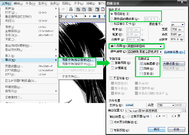 2.【输入范围】指的是导出的图所包含的部分,我选择裁剪掉裁切线,也就是成品在裁切线之内,包含出血。 出本子的,或许要把裁切线留着。