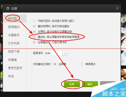 3、在【设置】界面下,点击选择【播放器】--勾选【播放时,禁止屏幕保护程序和电源管理】--【应用】选项完成设置。(如图所示)