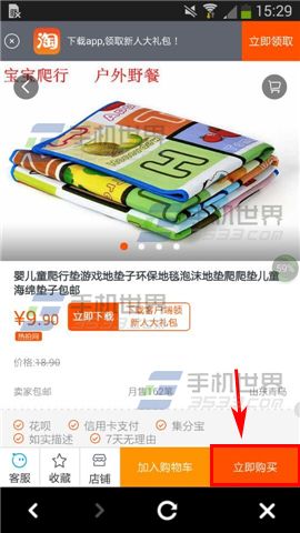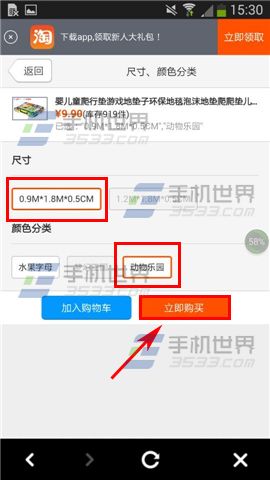 2)跳转到淘宝首页后点击右下角【立即购买】,然后选择【尺寸】【颜色分类】最后点击【立即购买】。(如下图)