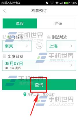 1)打开易周游,进入首页后点击【机票】按钮,跳转后选择好需要购买的是单程还是往返,并填写好出发城市、目的地以及出发日期,然后点击【查询】按钮。(如下图)