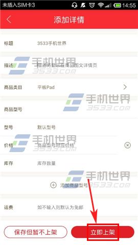 2)进入到自己的店铺,点击【发布商品】按钮,添加商品图片、标题、类型、描述、价格、库存以及运费后即可点击【立即上架】。(如下图)