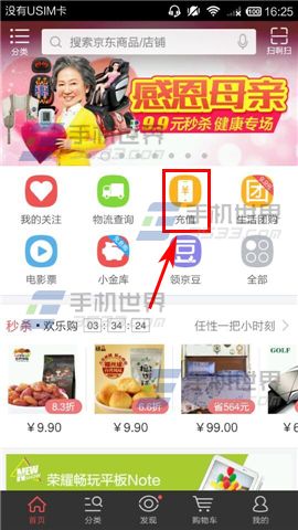 1)打开【京东】,进入首页后点击【充值】按钮。(如下图)