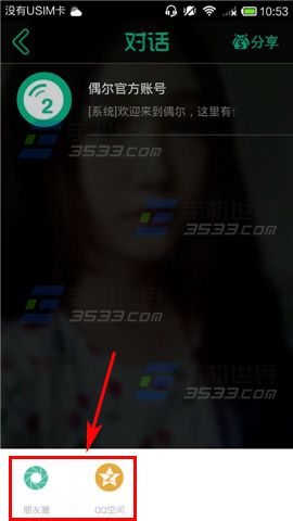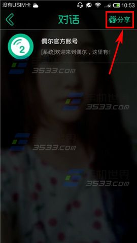 1)打开偶尔,进入首页后点击右上角的【消息】图标,跳转到对话页面,点击【分享】按钮。(如下图)