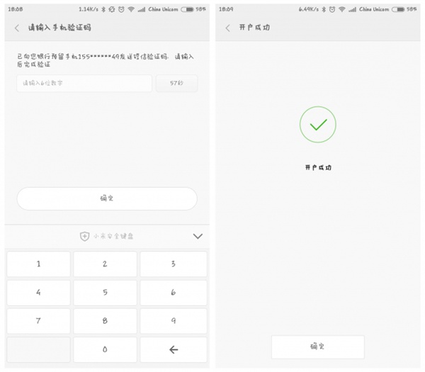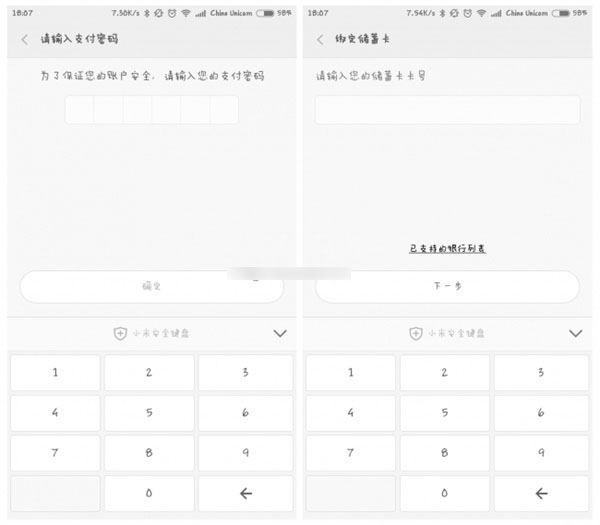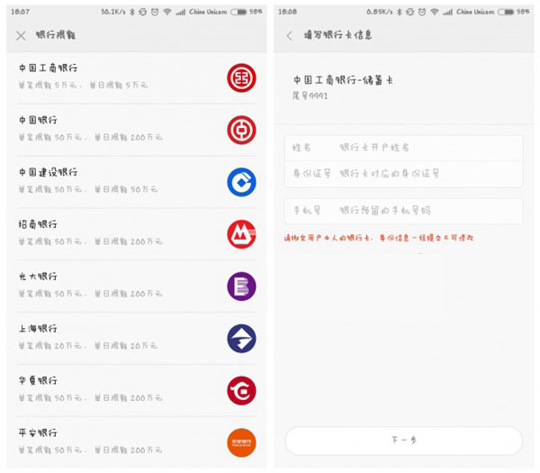3,点击开户,首先得设置支付密码。设置密码之后,提示填入银行卡号,上图为目前小米金融支持的银行列表:中国工商银行、中国银行、中国建设银行、招商银行、光大银行、上海银行、华夏银行、平安银行。填写好银行卡相关信息,进入下一步。如下图所示: