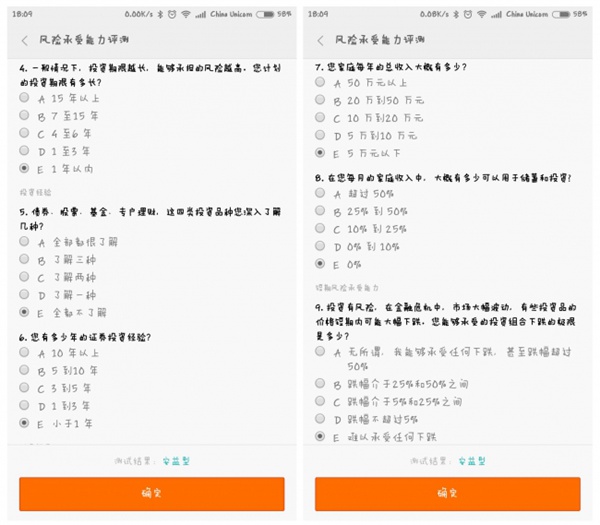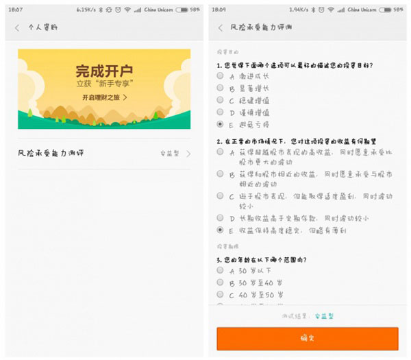 4,在个人资料里,还贴心的加入了“风险承受能力评测”。默认是“安益型”,大家炒股之前记得去测一测喔,这有利于大家的炒股方向。如下图所示: