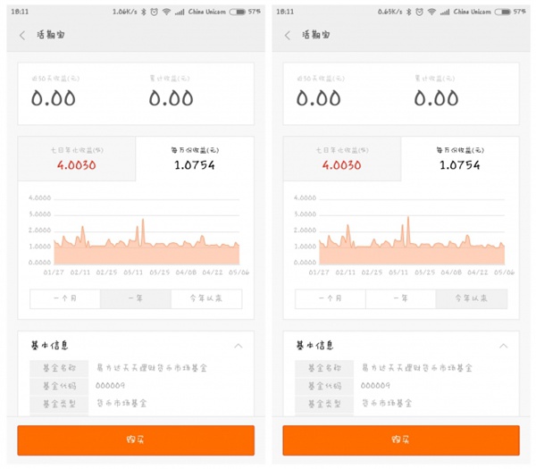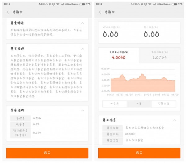 7,设置好开户以及了解的大概的情况,我们就可以准备购入 基金 啦。什么?点击购买没有这些界面,别着急,在进入购买页面之前,点击活期宝即可进入基金的详情界面,能看到该基金的 基本信息、基本特色、基金经理、费率结构。还能看到 月、年 收益情况,让用户买的更放心,如下图所示:
