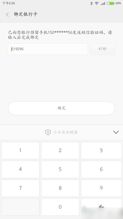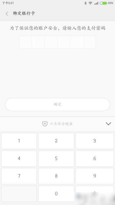 由于银行卡添加涉及到银行卡资金变动,所以这时系统需要验证身份,输入(或设置)你的小米支付密码