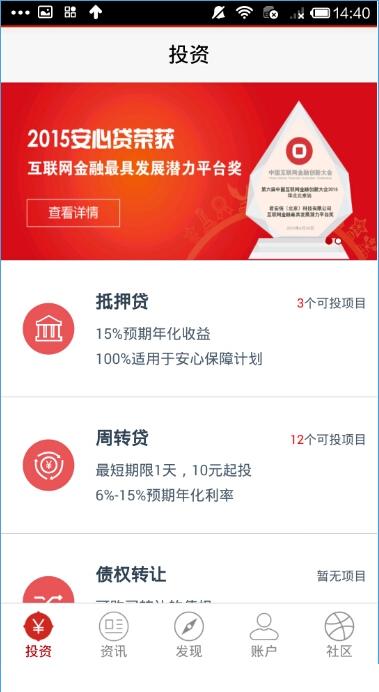 1、打开软件后进入软件的投资界面,即可看到抵押贷、周转贷、债权转让三类投资哦。