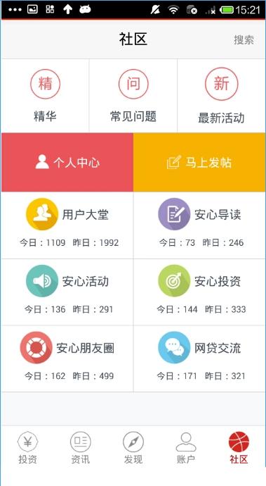 5、进入社区界面后,即支持用户大堂、安心导读、及发贴等功能。