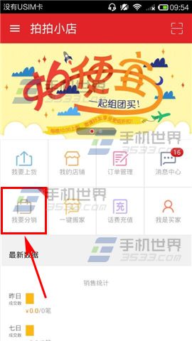 1)打开【拍拍小店】,进入首页后点击【我要分销】的入口。(如下图)