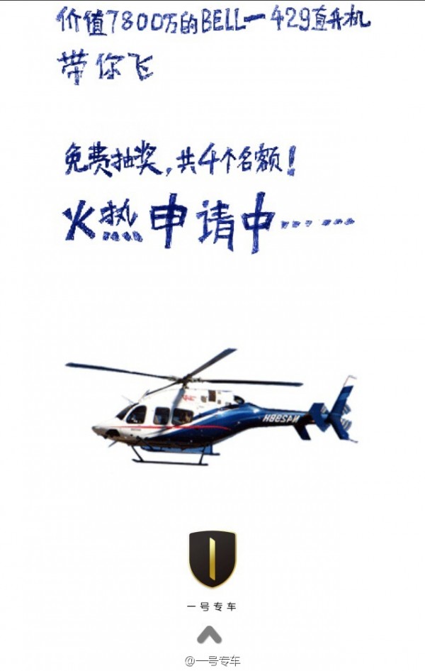5月15日消息,滴滴快的近日上线“一键叫飞机”服务,用户通过该公司旗下的一号专车APP可以预定直升机,首期航线包括北京APEC空中游览及北京-天津来回航线。根据滴滴快的的计划,一键叫飞机服务将于5月16日、17日两天开展,航线包括北京APEC空中游览和北京-天津来回航线,两者将分别由价值3500万的Bell-407直升机和价值7800万的Bell-429直升机提供服务,价格分别为1999元/人和3500元/人。