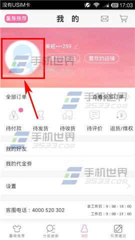 1)打开大码美衣,进入首页后点击【我的】按钮进入到个人中心,接着点击自己的【头像】。(如下图)