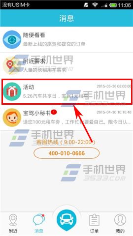 1)打开宝驾租车,进入首页点击左上角【图标】,接着点击【消息】按钮。(如下图)