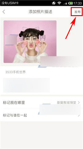 3)选择【相册获取】,跳转到本地相册,选取一张照片,所在地点是必须标记的哦,编辑好后点击【发布】即可。(如下图)