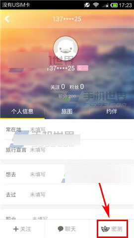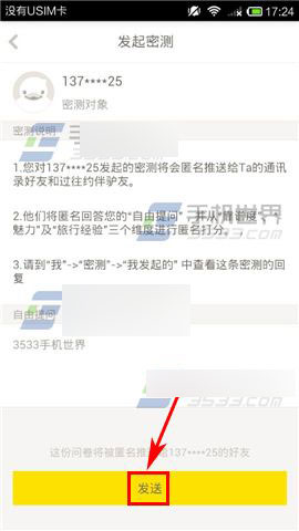 2)进入到该用户的【个人主页】后呢,点击右下角的【密测】按钮,输入想要提问的问题后点击【发送】即可,当然你可以从自己的好友中进行密测哒。(如下图)