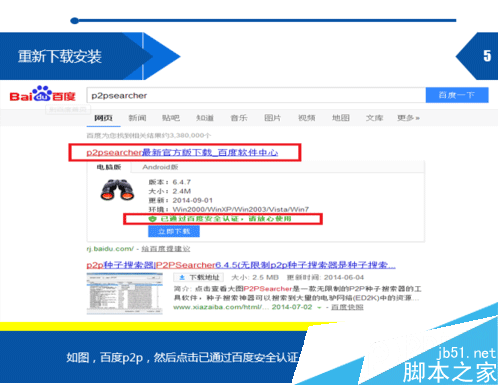 如图,百度p2p,然后点击已通过百度安全认证,请放心使用的p2p软件。