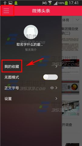 1)打开【微博头条】,点击主界面中的【三横】选择【我的收藏】。(如下图)