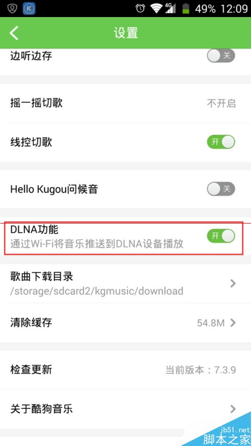7、酷狗音乐首先在设置界面确认打开”DLNA功能”
