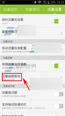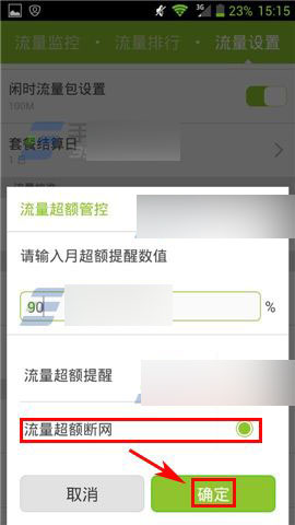2)在功能栏中找到【流量超额管控】点击进入,选择【流量超额断网】选项。最后不要忘记点【确认】。(如下图)